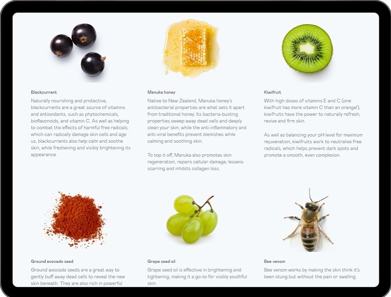 I also created the product descriptions and packaging copy for their premium skincare products and range of teas. And I wrote various bits for the snazzy new website, including product pages, ingredient descriptors, and blogs and nutritional info pages.
